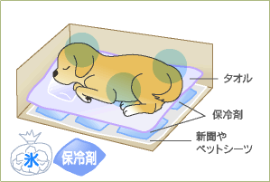 この時、保冷剤・氷をタオルで包まないでください。(暑い季節は、保冷剤・氷はこまめにかえてあげてください。)